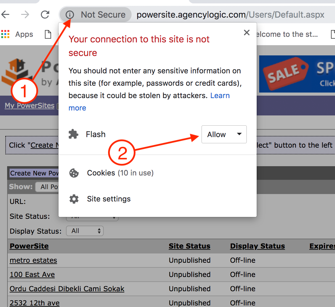 If you're having problems uploading documents or floor plans to your PowerSite, it's almost certainly because you're using Google Chrome as your browser (though you may have a similar issue with other browsers). Google Chrome now blocks Flash by default. Flash is the particular technology used for the document and floor plan upload feature and some browsers, most notably Google Chrome, disallows Flash from working automatically. If you used to be able to upload documents but now you can't, it's very likely that your browser updated to a new version and now doesn't allow Flash. You can update a setting in your browser to allow Flash to run on the AgencyLogic admin system and therefor allow you to upload documents.